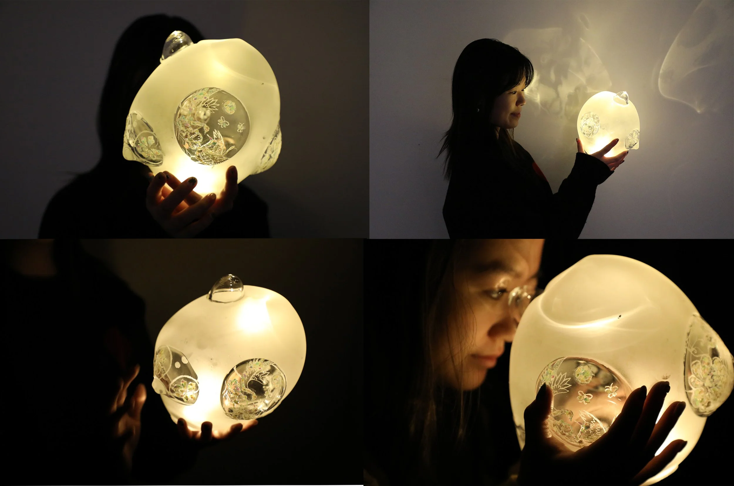 This piece is an ode to my traditional Korean roots. The organic glass blown shape mimics the lanterns used during festivals like Yeondeunghoe. The individual bubbles contain etched designs similar to the ones that are found in my grandmother’s furniture at her apartment in Korea. The designs on the glasswork include flakes of mother of pearl to further mimic mother of pearl artwork seen in gradient al Korean furniture.